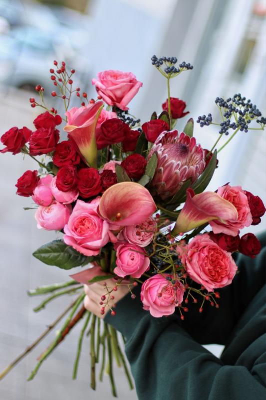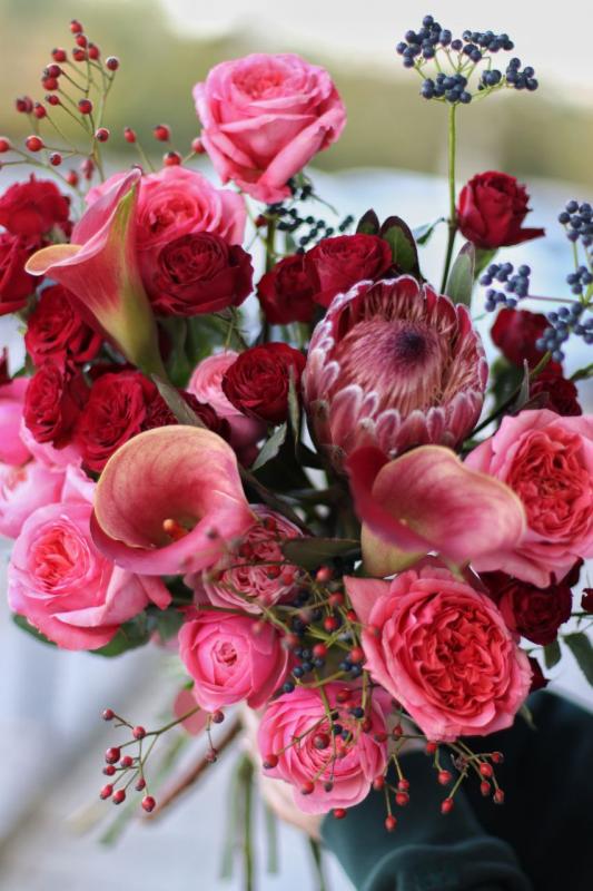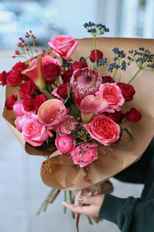 Протея, каллы, кустовая роза, одноголовая роза, вибурнум |