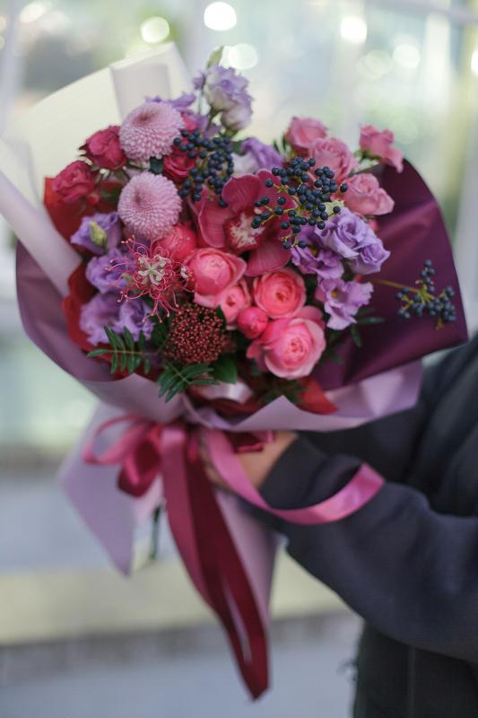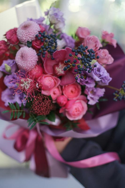 | Состав букета | Цимбидиум, вибурнум, кустовая пионовидная роза, хризантема, эустома, кустовая роза, скиммия |