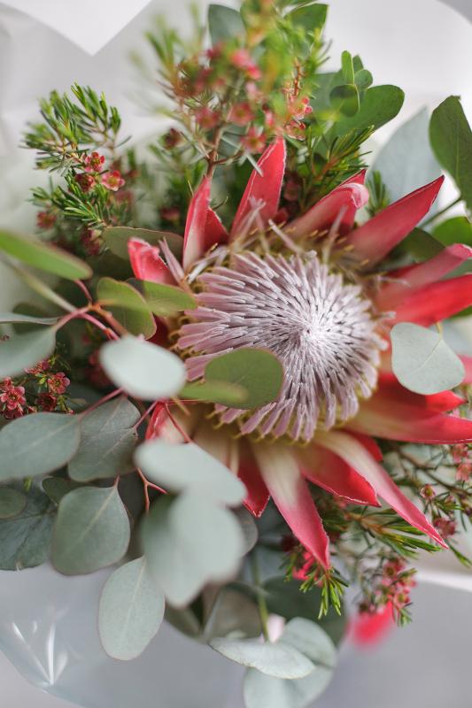 | Состав букета | Протея, хамелациум, эвкалипт |
