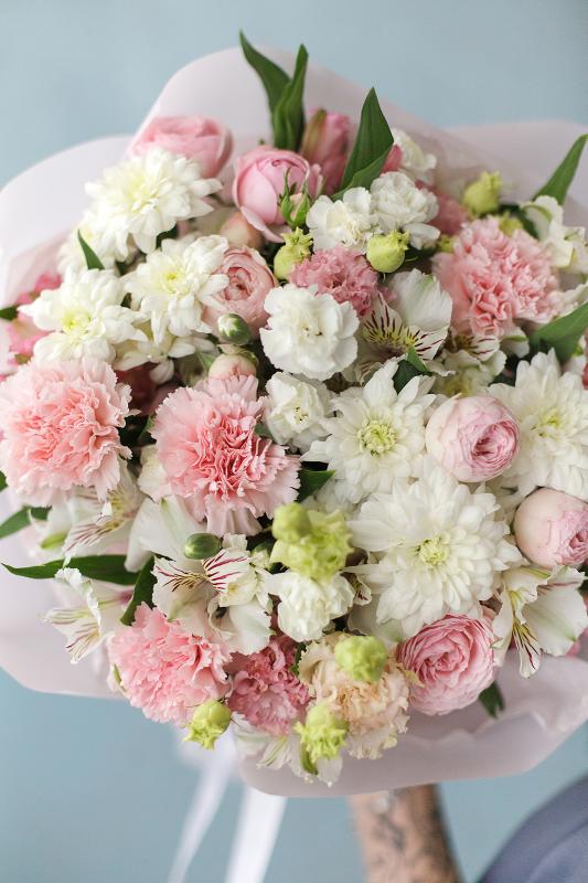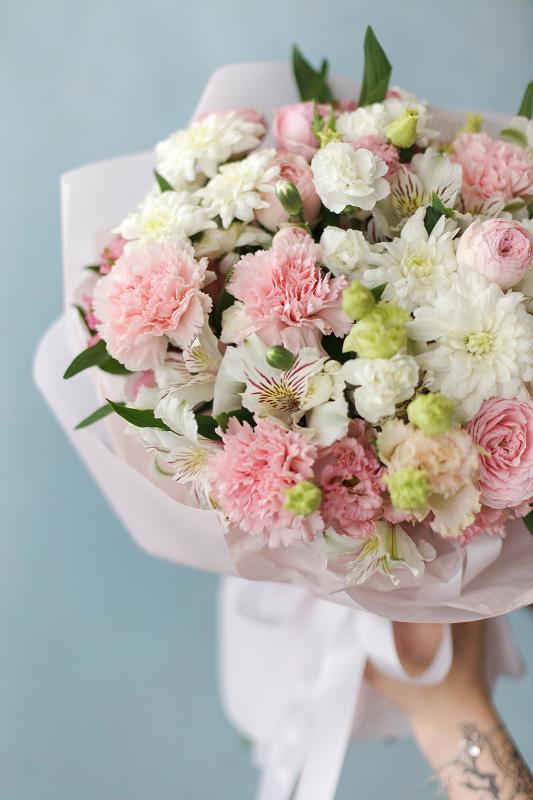 | Состав букета | Кустовая хризантема, гвоздика, эустома, альстромерия, кустовая пионовидная роза |
