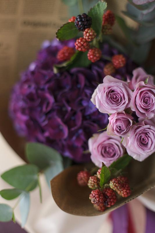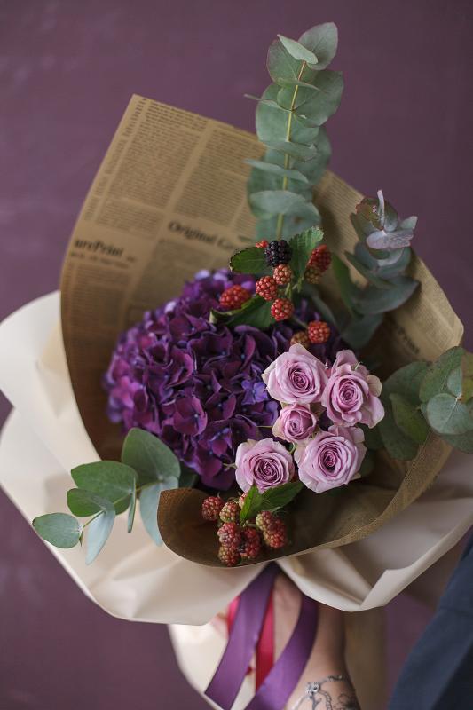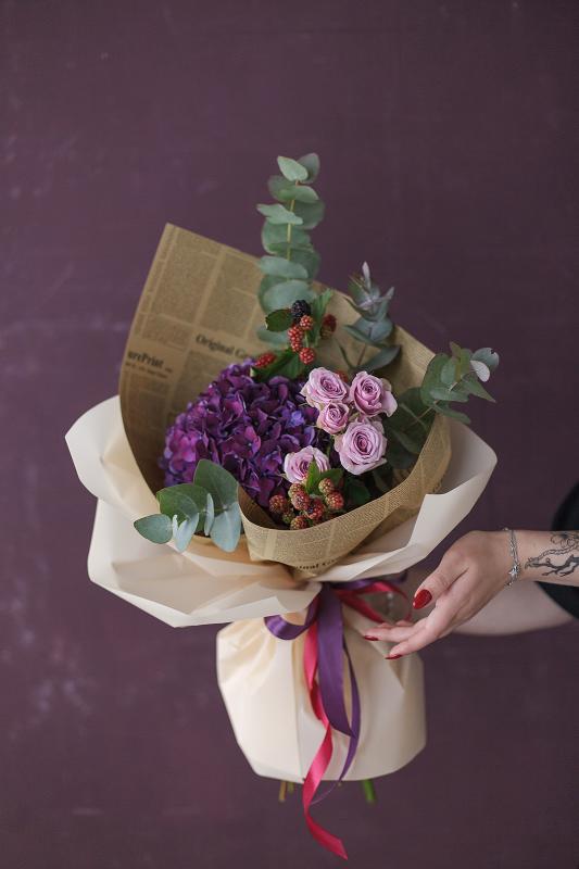 Состав букета | Гортензия, кустовая роза, рубус, зелень |