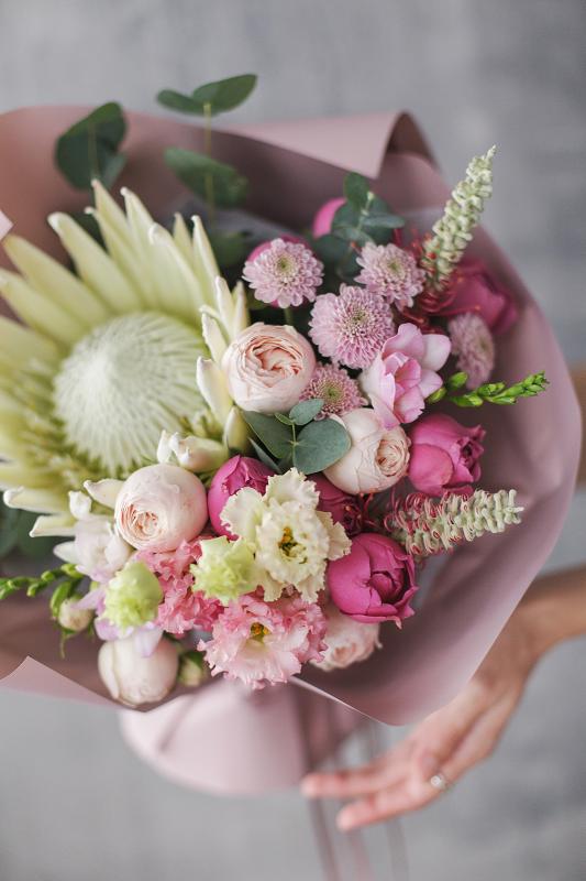Протея, кустовая пионовидная роза, кустовая хризантема, гревиллея, эустома |