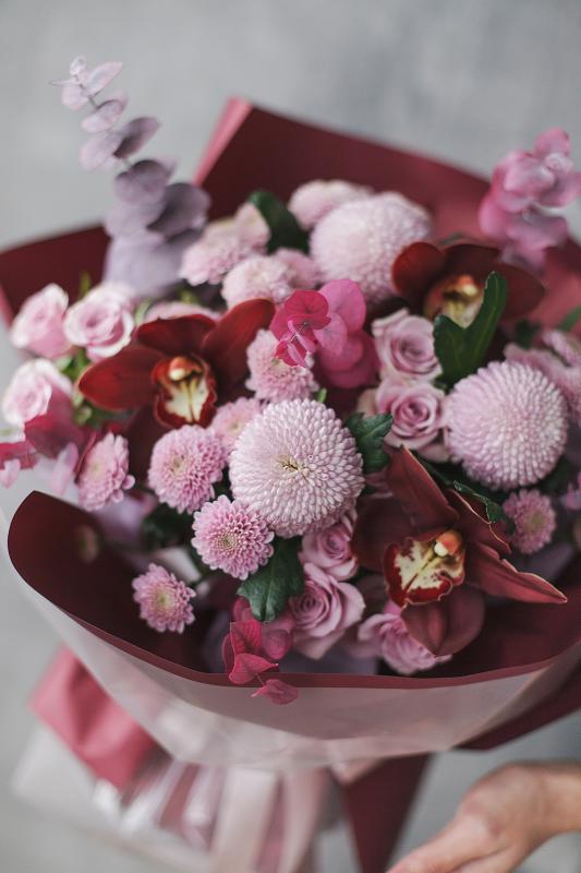 | Состав букета | Хризантема Момоко, цимбидиум, кустовая роза, кустовая хризантема, эвкалипт |