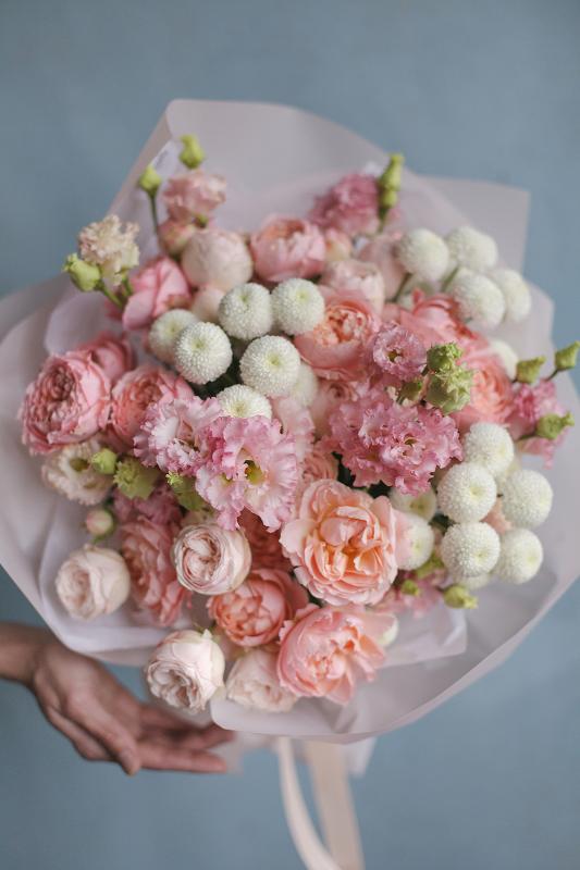 Состав букета | Кустовые хризантемы, эустомы, пионовидная роза |