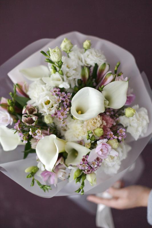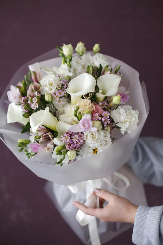Состав букета | Каллы, хамелациум, гвоздика, альстроимерия, эустома |
