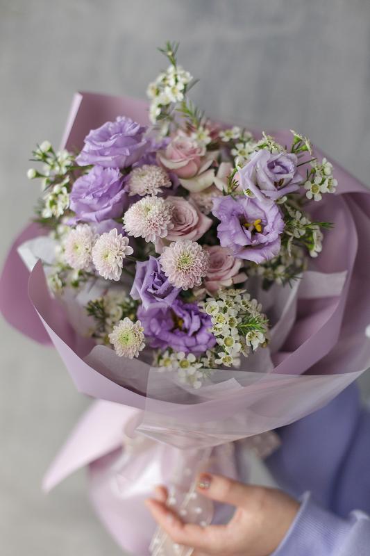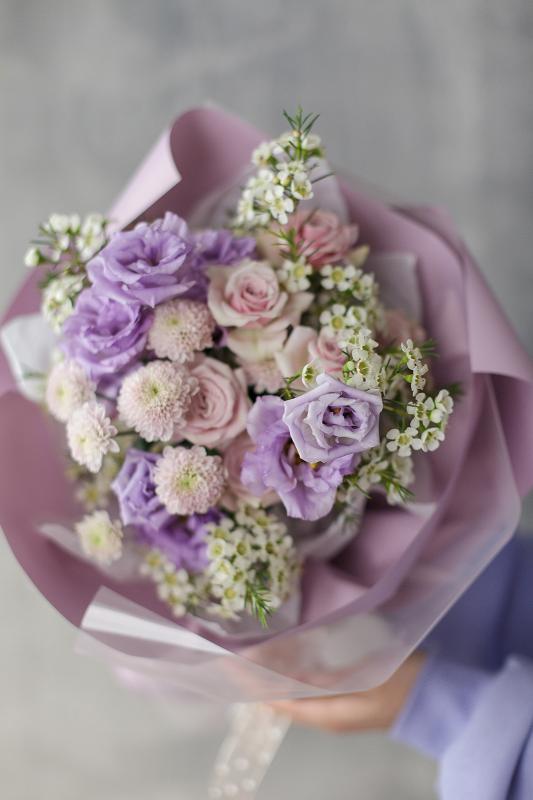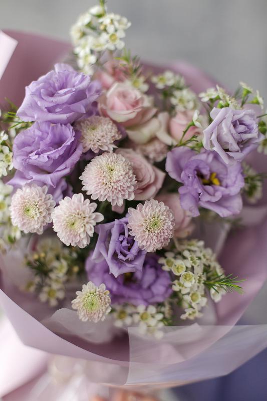 Состав букета | Кустовая роза, эустома, хамелациум, кустовая хризантема |