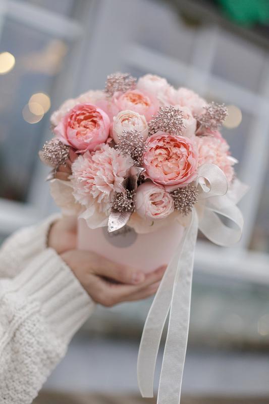 | Состав композиции | Кустовая пионовидная роза, гвоздика, скиммия |