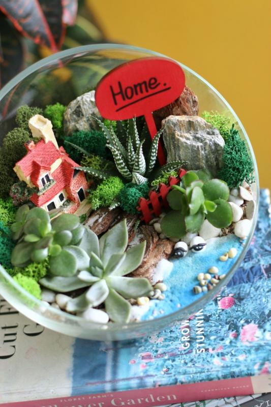 | Состав композиции | Суккуленты микс, грунт/ керамзит, декоративный песок, стабилизированный мох, миниатюрные фигурки. |