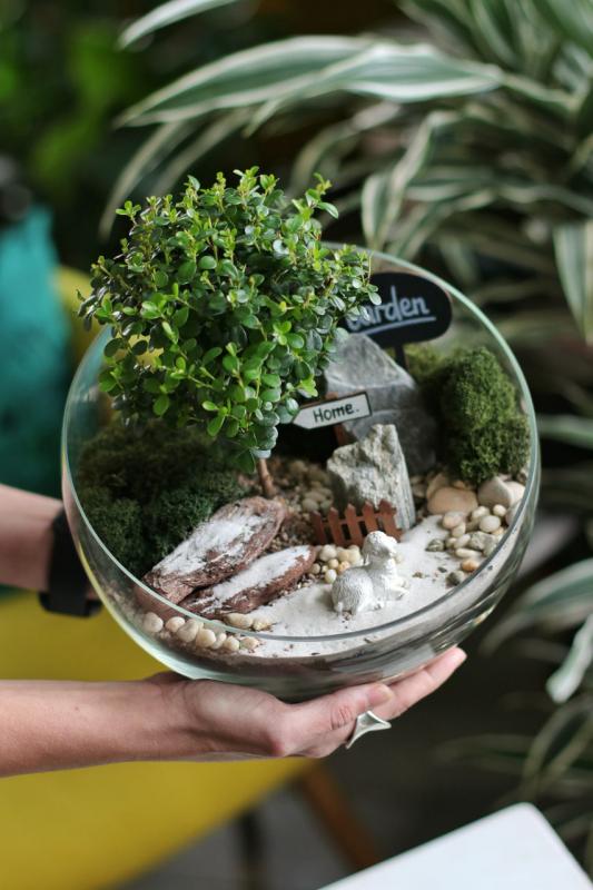 Состав композиции | Мирсина, грунт/ керамзит, декоративный песок, миниатюрные фигурки, мох, состав для имитации воды |