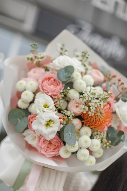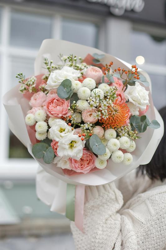 Букет упакован в корейский матовый целлофан с декоративными лентами. Исходя из Ваших предпочтений, может быть оформлен в любой цветовой гамме. |
