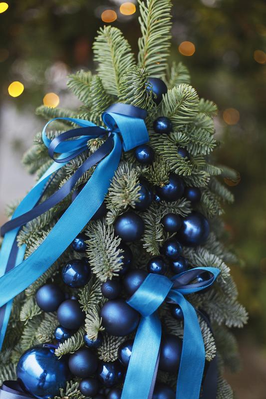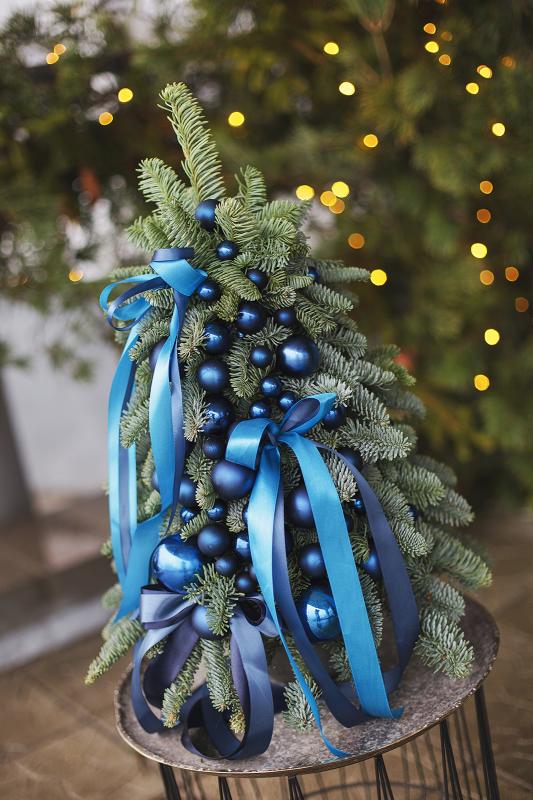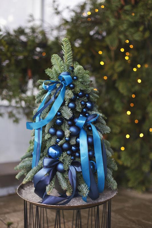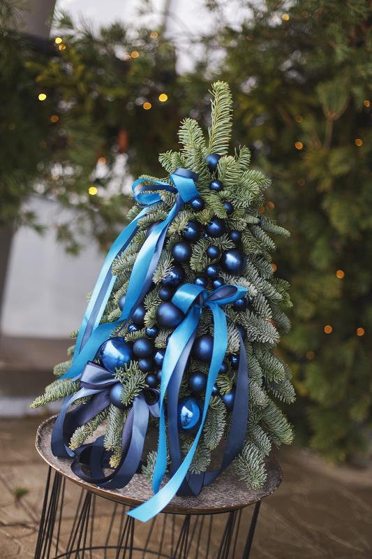 | Состав и оформление | Елка выполнена из натуральной пихты nobilis, закреплена в керамическом кашпо. Декорирована шариками, лентами. |
