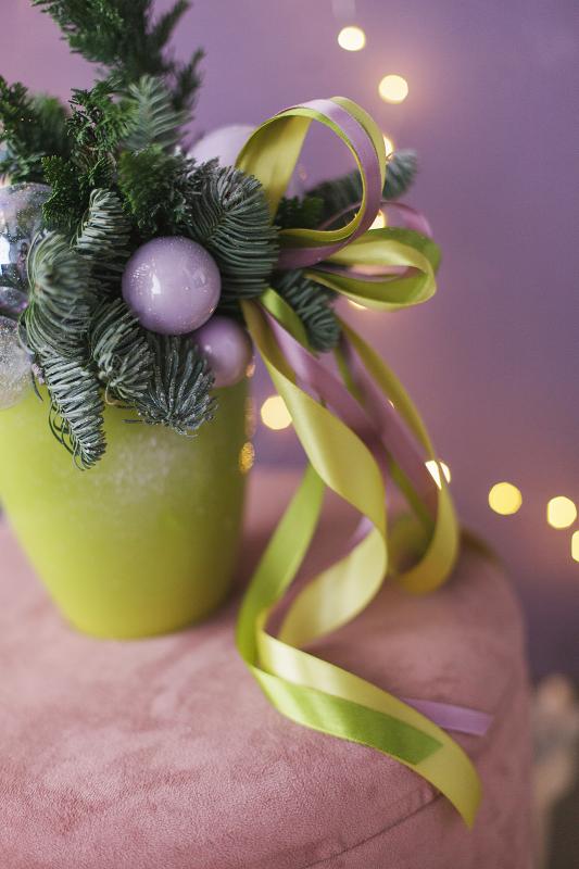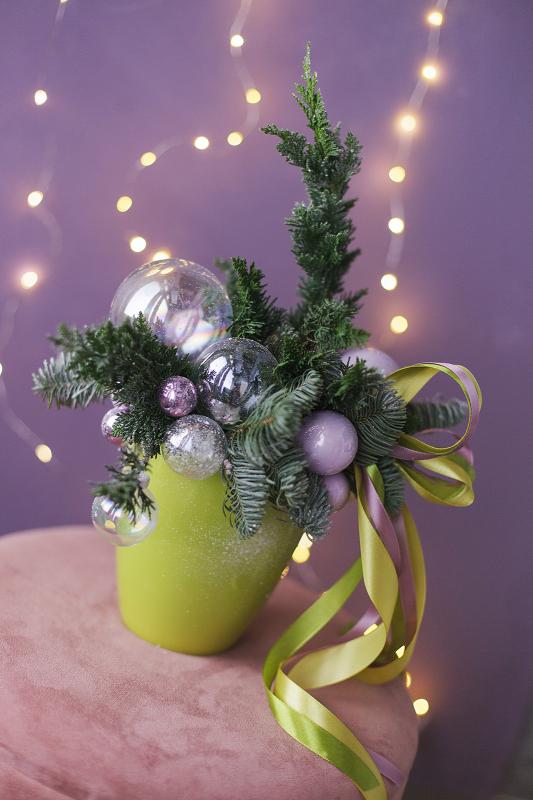 | Состав композиции | Композиция выполнена в керамическом кашпо из натуральной пихты nobilis. Декорирована новогодним декором |