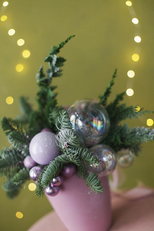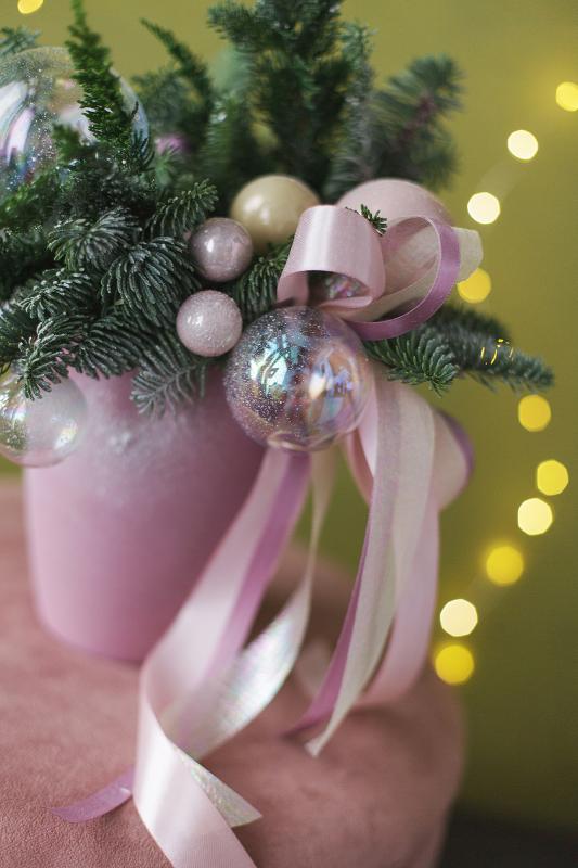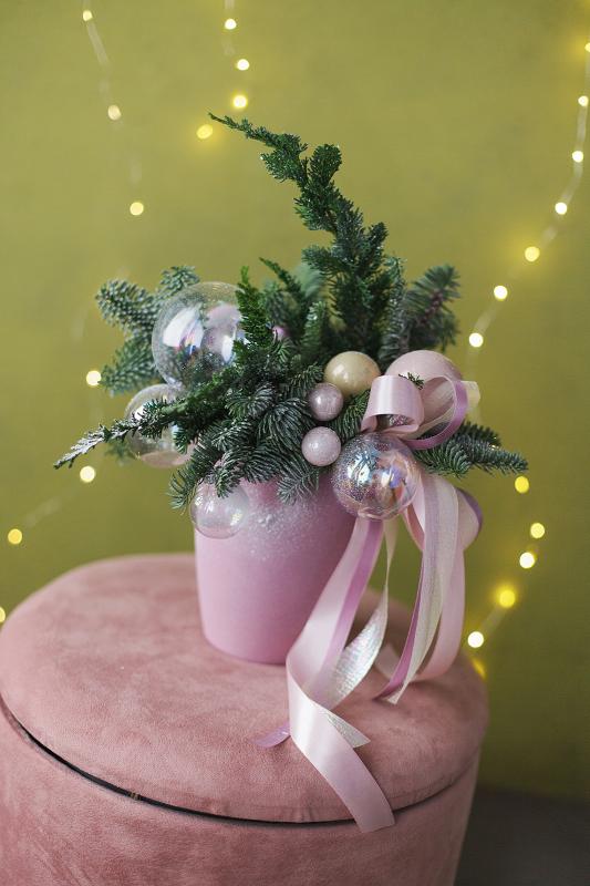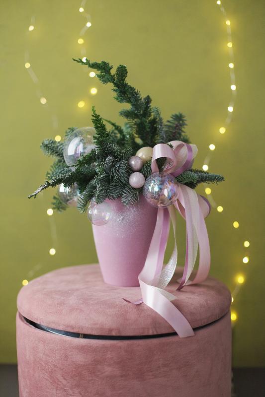 | Описание | Композиция выполнена в керамическом кашпо из натуральной пихты nobilis. Декорирована новогодним декором |