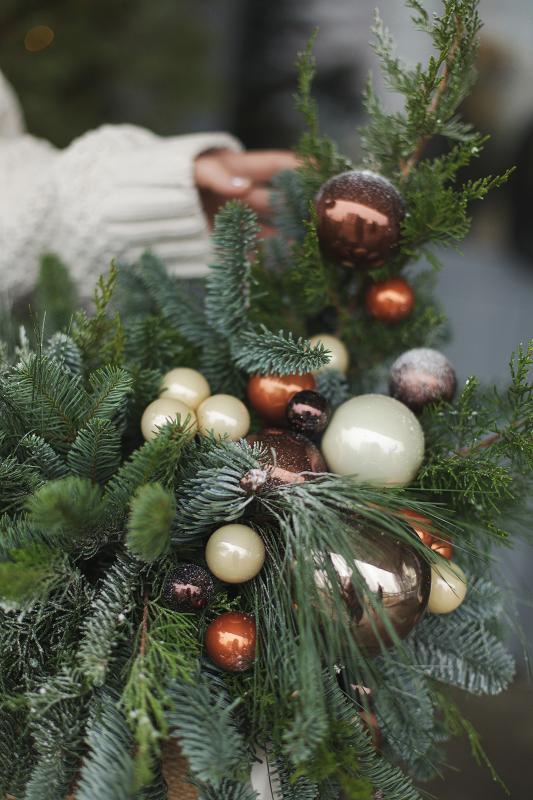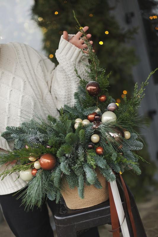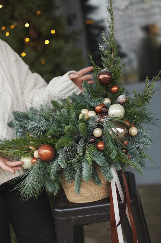 | Состав композиции и оформление | Композиция выполнена в плетеной корзине из натуральной пихты nobilis (не осыпается). Декорирована новогодними шарами. |