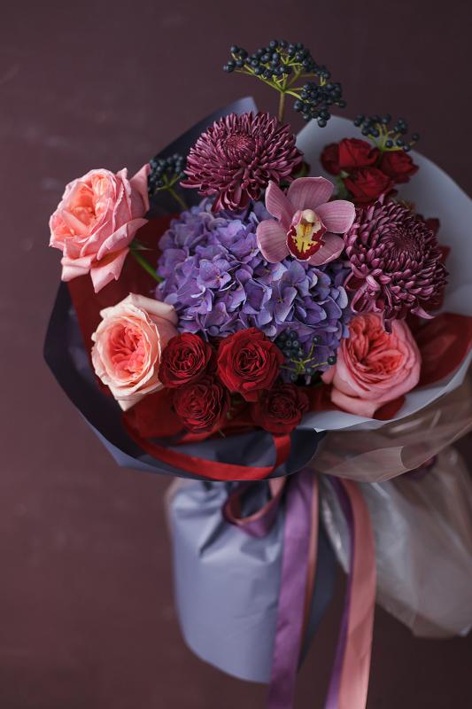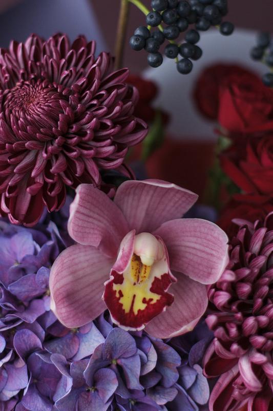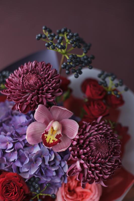 | Состав композиции | Гортензия, хризантема, цимбидиум, кустовая роза, одноголовая роза |