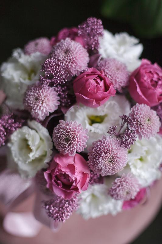 | Состав букета | Кустовая роза, кустовая хризантема, эустома, скиммия |