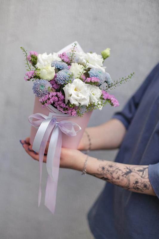 | Состав композиции | Кустовая хризантема, статица, эустома |